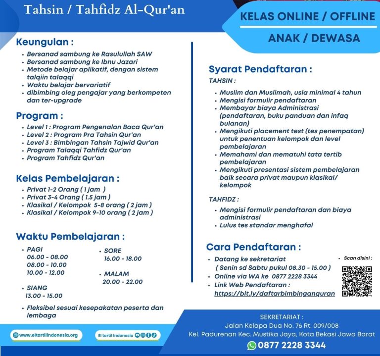 PENERIMAAN PESERTA BARU by Media Eltartil October 21, 2023 Program Tahsin & Tahfidz Al Qur’an El Tartil Jika bersedia mengikuti program pembelajaran Al Qur'an di LBQ El Tartil, silahkan mengisi formulir pendaftaran KLIK DIBAWAH INI Berikutnya Share FacebookTwitterPinterestEmail